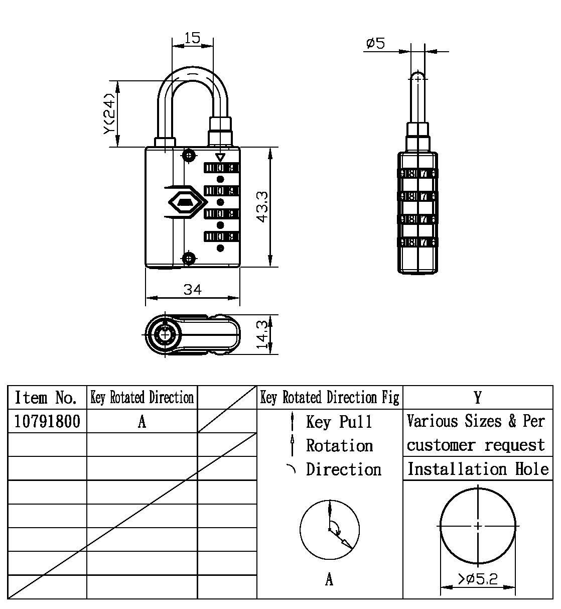 3. 鋅合金材質外殼與鎖心,鎖勾為直徑 5mm