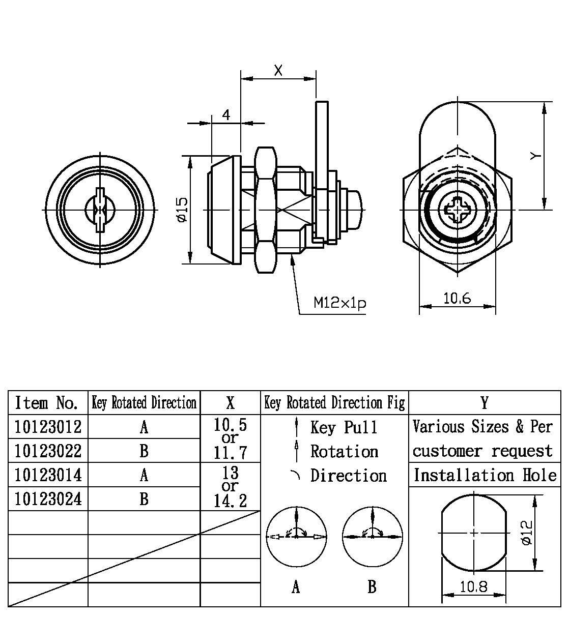 1、鎖心內牙採螺絲固定2、銅或鋅合金鎖殼及鎖心3、適用於金屬/非金屬、木門、箱子、盒子、工具櫃、抽屜等4、500 個以上號碼變化5、附舌片及螺帽(舌片"A,B "尺寸可依客戶需求提供,或參考附件類)6、鎖心外牙採螺帽固定